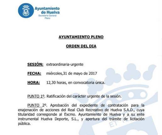 Como habían anunciado los políticos, el pliego de condiciones para la venta del Recreativo de Huelva saldrá a la luz esta semana. Concretamente será aprobado este miércoles en un Pleno Municipal Extraordinario, a celebrarse en el Ayuntamiento, a las 12.30 horas, en convocatoria única.