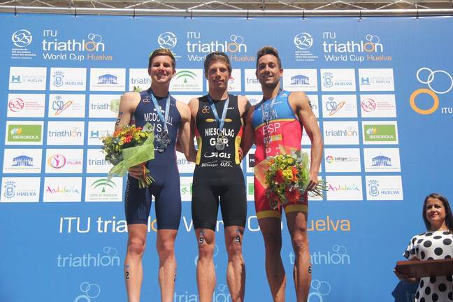 'Alemania por encima de todo' reza el himno germano. Y a esas letras hizo justicia Justus Nieschlag con su triunfo en la prueba de la Copa del Mundo de Huelva. El triatleta teutón ganó el oro, seguido del estadounidense Kevin McDowell y del español Uxio Abuín, artífice de una espectacular remontada que le condujo del décimo primer puesto al podio.