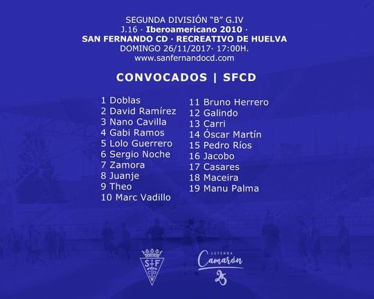 De este modo, el San Fernando presenta una citación con 19 futbolistas, incluido Pedro Ríos, al que se había dado por descartado por su lesión. No obstante, el ex del Decano apunta a ser el obligado descarte por su largo periodo de inactividad.