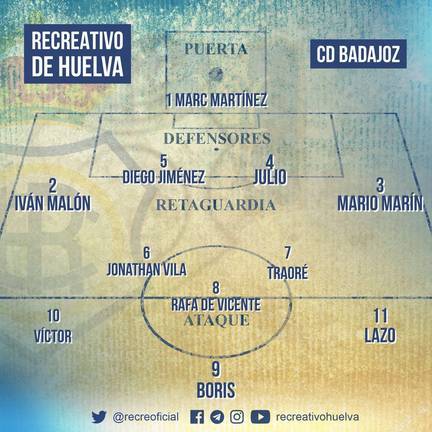 RECREATIVO DE HUELVA: Marc Martínez; Iván Malón, Julio Rodríguez, Diego Jiménez, Mario Marín (Nacho Monsalve, min.46); Jonathan Vila, Traoré; Lazo, Rafa de Vicente (Gorka Santamaría, min.77), Víctor Barroso (Núñez, min.53); y Boris.