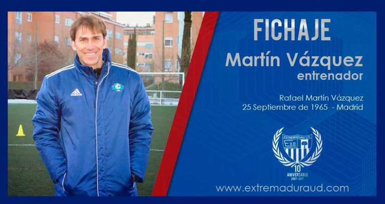 Se trata de Rafael Martín Vázquez, que hoy se ha convertido en el flamante preparador del Extremadura, tras el cese sorpresa de otro ex del Real Madrid, Manolo Ruiz. El 'mister' saliente tenía al cuadro de Almendralejo tercero en la clasificación y a tres puntos del líder, después de golear este fin de semana al Écija (4-0). Sin embargo, la directiva ha alegado "falta de confianza" para justificar su decisión.