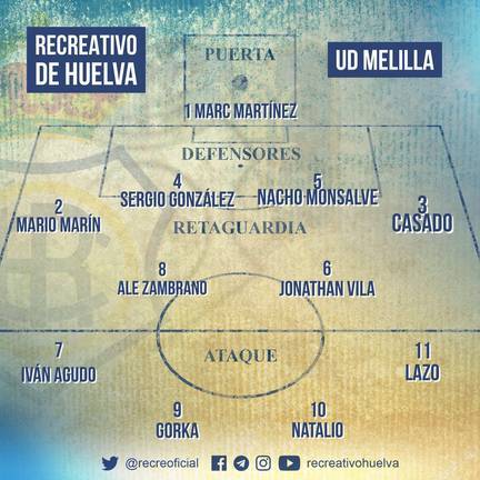 RECREATIVO: Marc Martínez; Mario Marín, Sergio González, Nacho Monsalve, Casado; Iván Agudo, Jonathan Vila (Rafa de Vicente, min.51), Álex Zambrano (Toni Robaina, min.75), Lazo; Natalio (Boris, min.51) y Gorka Santamaría.