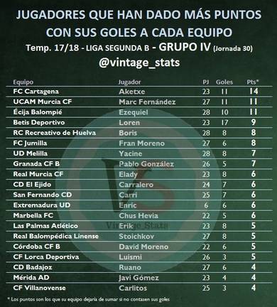 Se trata de Boris Garrós, cuyos ocho goles han reportado al Decano un total de ocho puntos, según un estudio de @vintage_stats. Sólo Loren (hoy en la primera plantilla del Betis), Ezequiel (Écija), Marc Fernández (UCAM) y Aketxe (Cartagena) tienen más incidencia en sus equipos que el delantero catalán. Al que tampoco le vale ser el futbolista más determinante del Recre para entrar en las alineaciones de César Negredo.