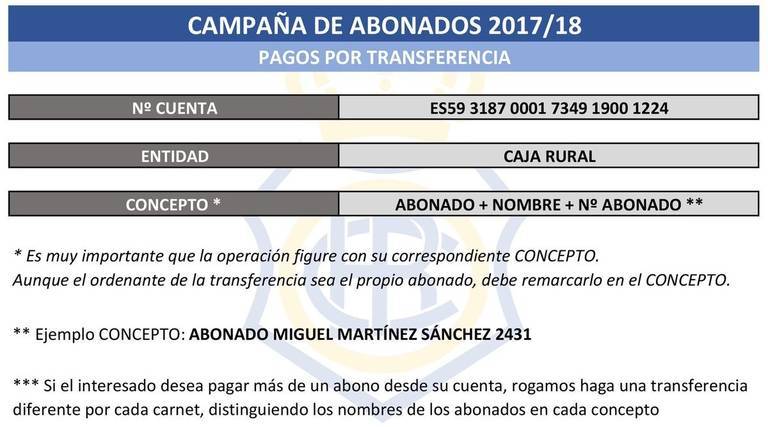 Desde el club se recuerda que la campaña de cobro de los abonos continua y que las taquillas del Nuevo Colombino abrirán este jueves y viernes, de 10.00 a 14.00 y de 16.00 a 19.00 horas; y el sábado de 10.00 a 14.00 horas. Se puede pagar al contado o con tarjeta. Además se ha habilitado una cuenta para los que prefieran realizar la operación por transferencia bancaria.