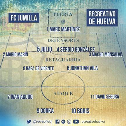 RECREATIVO: Marc Martínez; Mario Marín, Sergio González (Álex Zambrano, min.55), Julio Rodríguez, Nacho Monsalve; Iván Agudo (Lazo, min.80), Jonathan Vila, Rafa De Vicente, David Segura; Gorka Santamaría y Boris (Toni Robaina, min.59).