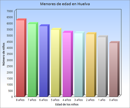 Además las gráficas muestran como cada vez más el número de menores va decreciendo en función de la edad. A menor edad, menor número de niños una tendencia que de ocho a cero años es plenamente decreciente. De esta forma mientras que en la actualidad Huelva cuenta con 6.245 niños de ocho años, la gráfica para los que todavía no han cumplido el año de edad se reduce hasta los 4.383 y cada año va decreciendo tal y como se observa en la siguiente tabla: