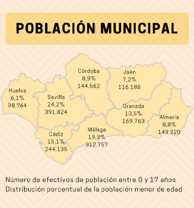 En cuanto a la distribución por municipios, los diez municipios con mayor número de población de 0 a 17 años son: Sevilla (124.289), Málaga (107.364), Córdoba (60.795), Jerez de la Frontera (43.759), Almería (39.071), Granada (38.283), Dos Hermanas (29.929), Marbella (28.432), Huelva (27.629), y Algeciras (25.916) son los que cuentan con mayor efectivo de población menor de edad.