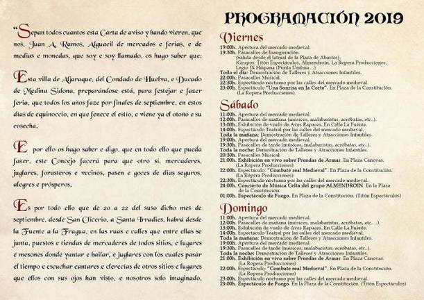 En esta edición, el Mercado Medieval de Aljaraque contará con 70 puestos artesanos llegados desde diferentes puntos de la geografía española, además de numerosas barras y puestos gastronómicos. La apertura del Mercado tendrá lugar el viernes 20, a partir de las 19:00 horas, mientras que el gran pasacalles de inauguración, que saldrá desde la plaza de abastos, dará comienzo a las 19:30 horas. Desde ese momento, y hasta la noche del domingo, Aljaraque será escenario de mil y una actividades dirigidas a todos los públicos, ya que no faltarán talleres y atracciones infantiles, espectáculos nocturnos, pasacalles musicales, actuaciones teatrales, exhibiciones de vuelos de aves rapaces, malabaristas, acróbatas, combates medievales, conciertos o espectáculos de fuego, entre otras muchas iniciativas.