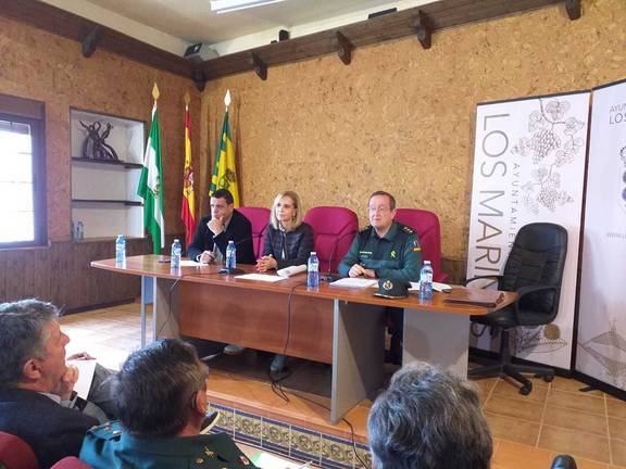 La subdelegada del Gobierno en Huelva, Manuela Parralo, el coronel jefe de la Guardia Civil, Andrés López,y los alcaldes de la comarca serrana, además de varios miembros de organizaciones agrarias y representantes del sector de la castaña, han mantenido este lunes una reunión de trabajo que se ha celebrado en el Ayuntamiento de los Marines para analizar las actuaciones y adoptar las medidas de seguridad para la prevención de cara a la campaña de recogida de este producto.