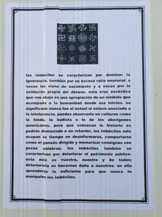 "Los imbéciles se caracterizan por dominar la ignorancia. También por su escasa ratio neuronal. A veces les viene por nacimiento y a veces por la oxidación propia del desuso. Esta cruz esvástica que ves abajo es la apropiación de un símbolo que acompaña a la humanidad desde sus inicios. Su significado nunca fue el actual ni estuvo asociado a la intolerancia. Puedes observarla en culturas como la hindú, la budista o la de los aborígenes americanos. Pero que conozca la historia es pedirle demasiado a un retarder", publican desde el IES.