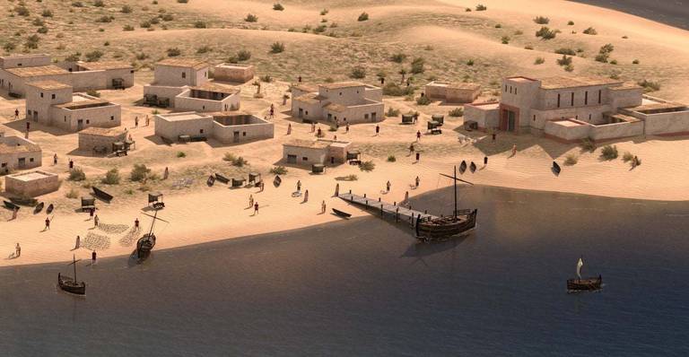En esta recreación arquitectónica realizada por Rafael Robles, podemos imaginar cómo era la vida en Saltés sobre el año 570 a.C.  Discurría todo en torno al santuario tartésico consagrado a Heracles según Estrabón junto al que vivía una pequeña población de pescadores y comerciantes. La historia de Huelva.