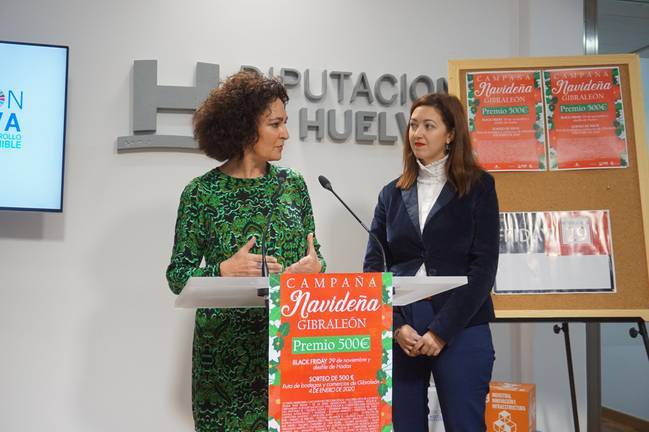 La presidenta de la Asociación de Empresarios de Gibraleón, Silvia Ponce, integrada en la FOE, acompañada por la alcaldesa de esa localidad, Lourdes Martín, han presentado en la Diputación Provincial de Hueva la campaña de Navidad que ese colectivo va a desarrollar en los próximos días y cuyo pistoletazo de salida será el próximo viernes coincidiendo con el Black Friday.