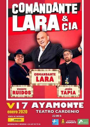El Teatro Cardenio de Ayamonte recibe este viernes, a las 22.00 horas, a Luis Lara, más conocido como el “Comandante Lara”, que junto a Jesús Tapia y Vicente Ruidos, que ejercerán de teloneros, ofrecerá el espectáculo “Comandante Lara y Cía”, en el que, a través de diferentes monólogos, abordarán temas tan comprometidos como divertidos.