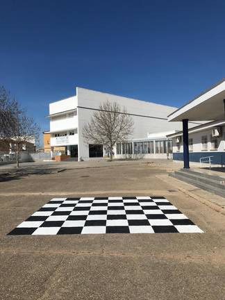 El centro a petición del equipo “Aula Djaque” ha adquirido un juego completo de piezas gigantes de 62 cm de altura y el tablero de 4 x 4 metros ha sido diseñado y pintado en el patio del instituto por el propio alumnado.