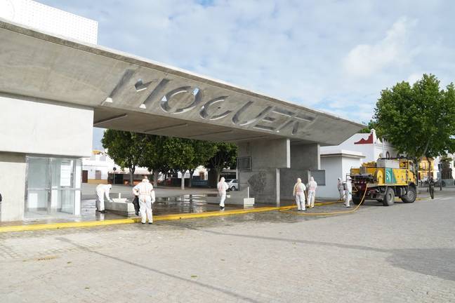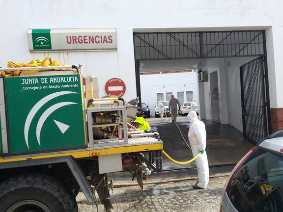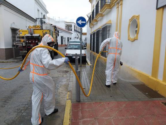 Efectivos del Infoca han estado limpiando y desinfectando durante toda la mañana algunas de las zonas más vulnerables de Moguer, como medida esencial para seguir luchando contra el Covid-19.