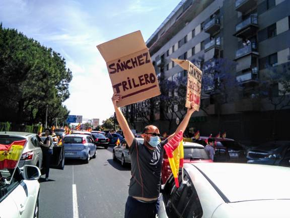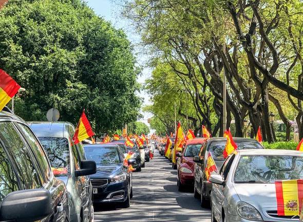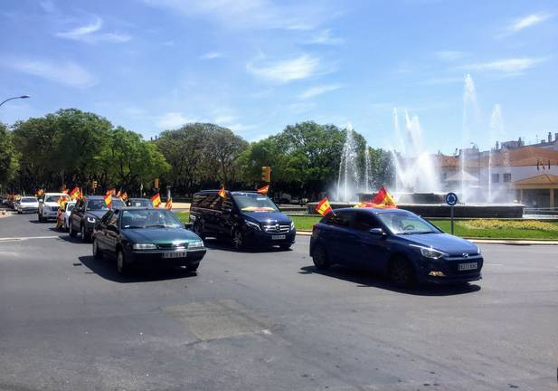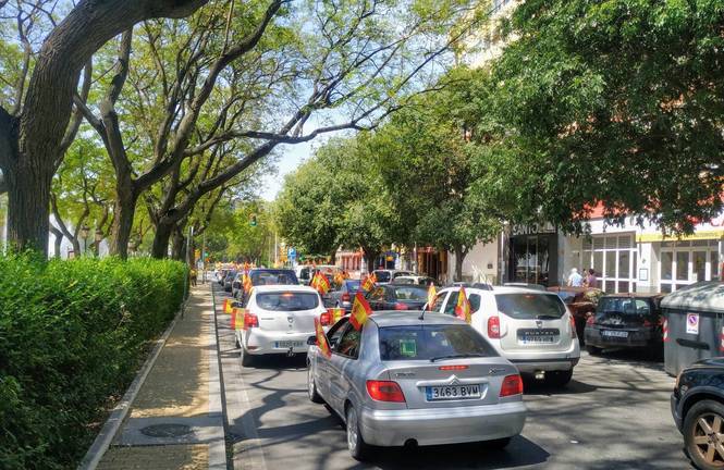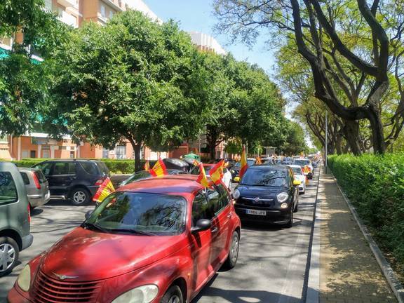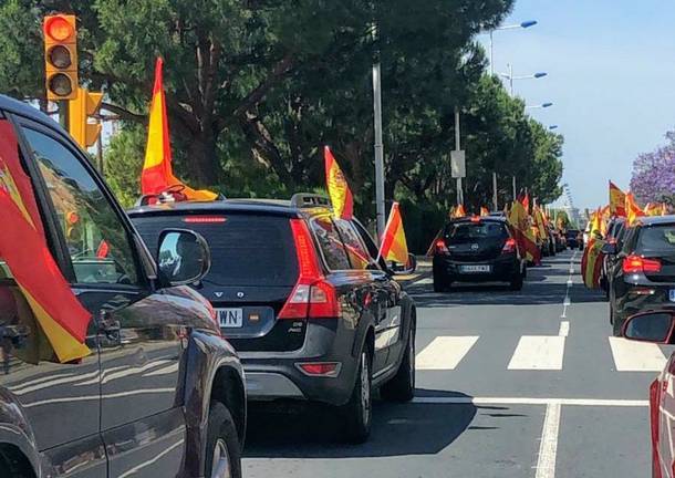 Decenas de coches y motos se han sumado hoy en Huelva a la caravana convocada por Vox en todas las capitales de España para protestar por la actuación del Gobierno durante la crisis de la Covid 19 y exigir el fin del estado de alarma y la dimisión del Ejecutivo de Pedro Sánchez. Con ondeantes banderas de España, la caravana ha partido de la Avenida de Andalucía, para continuar por la calle San Sebastián hasta la rotonda del Litri.