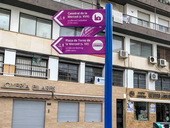 Los postes facilitan el itinerario del turista no sólo hasta los elementos patrimoniales, históricos y turísticos, cuya información también aparece en inglés, sino también hacia lugares de interés como el Mercado del Carmen, el Centro Comercial Abierto Calles del Centro, la estación de autobuses, los hoteles o el Estadio Nuevo Colombino.