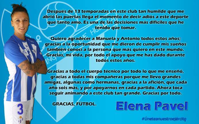 En una carta en las redes sociales, Elena ha transmitido su agradecimiento a todos los estamentos del club. De su lado, desde el Sporting de Huelva se subraya que la entidad "sólo tiene palabras de elogio en lo profesional y en lo personal hacia la futbolista que más temporadas ha vestido la camiseta del primer equipo". Si las circunstancias lo permiten, Pavel se despedirá próximamente en una rueda de prensa.