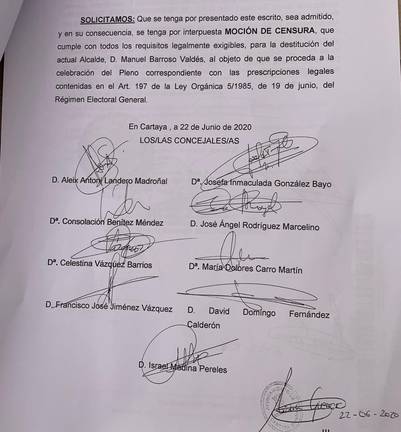 La moción de censura tiene la firma de nueve concejales, es decir, de la mayoría absoluta de los miembros que integran la Corporación municipal.