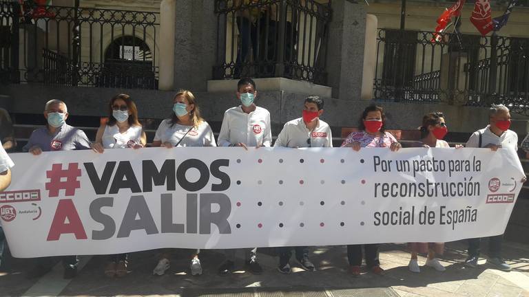 Los secretarios generales de UGT y CCOO de Huelva, Sebastián Donaire y Emilio Fernández respectivamente, han reclamado hoy en la plaza de las Monjas, bajo el lema “Vamos a salir. Por un pacto para la reconstrucción social de España” una reconstrucción social y económica del país tras la pandemia.