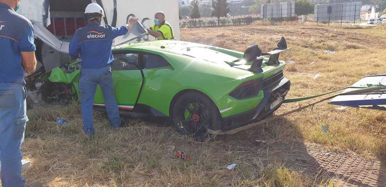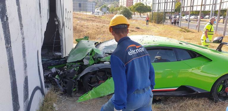 La Policía Local está investigando las circunstancias que han rodeado a un espectacular accidente de tráfico que se ha producido esta mañana a las 6.15 en la calle Pilar Miró de la capital onubense. Allí, empotrado en una caseta eléctrica, apareció un coche de alta gama muy similar al Lamboghini Huracán valorado nuevo en 300.000 euros.