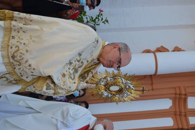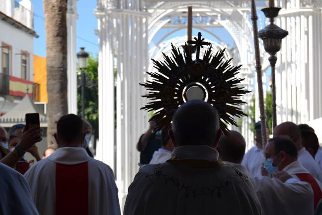 A la conclusión, y ante la imposibilidad de procesionar con el Santísimo, D. Santiago Gómez, con la Custodia en sus manos, se ha dirigido hasta la puerta principal del templo parroquial para bendecir a todo el pueblo almonteño, muchos de ellos en la plaza ante la limitación de aforo debido al Covid-19.