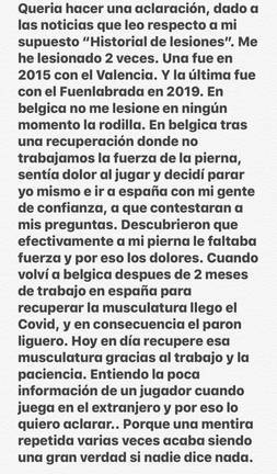 En una nota, el delantero aclara que sólo se ha lesionado "dos veces. Una fue en 2015 con el Valencia. Y la última fue con el Fuenlabrada en 2019. En Bélgica no me lesioné la rodilla", si no que "tras una recuperación donde no trabajamos la fuerza de la pierna, sentía dolor al jugar y decidir parar e ir a España con mi gente de confianza. Hoy he recuperado esa musculatura gracias al trabajo y la paciencia", sentencia.