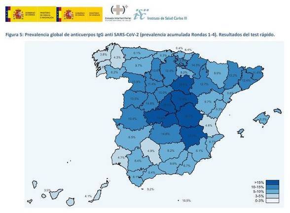 Tres provincias tienen una prevalencia global acumulada de más del 18%: Cuenca, Soria y Madrid. Con menos de un 5%, se ha detectado la circulación del coronavirus en Las Palmas y Santa Cruz de Tenerife, Lugo, Pontevedra y A Coruña, Valencia, Huelva (4,7) y Córdoba.