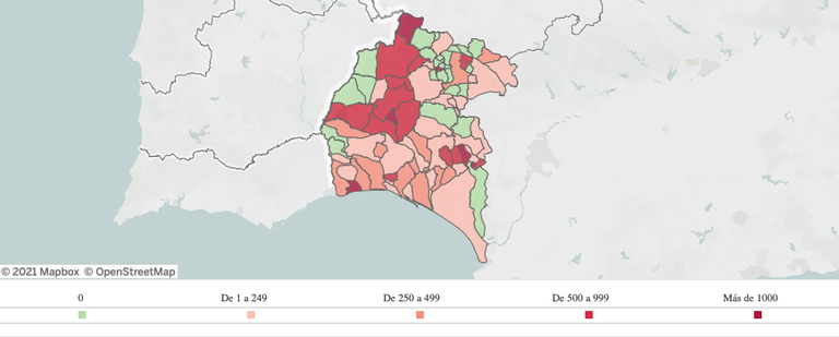 Respecto a una tasa superior a 500 casos e inferior a 1.000 se encuentran los municipios de Aljaraque, Alosno, Aroche, Calañas, Cortegana, Corteconcepción, Chucena, El Cerro del Andévalo, La Palma del Condado, Puebla de Guzmán y Villarrasa.