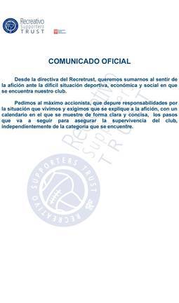 A remolque del comunicado de la Federación de Peñas de hace unos días, los trusistas han emitido una nota pública con la que se suman "al sentir de la afición ante la difícil situación deportiva, económica y social en que se encuentra nuestro club". En este sentido, piden "al máximo accionista que depure responsabilidades".