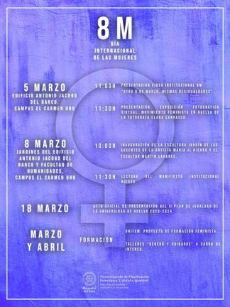La Universidad de Huelva (UHU), a través de su Dirección de Igualdad y Atención a la Diversidad, dependiente del Vicerrectorado de Planificación Estratégica, Calidad e Igualdad, ha organizado un amplio programa de actividades para conmemorar el 8 de Marzo, Día Internacional de las Mujeres. Una programación que, debido a la situación actual de pandemia, se ha adaptado al formato virtual.