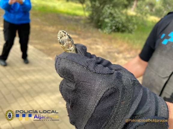 Agentes de la Policía Local de Aljaraque fueron requeridos por vecinos de La Monacilla, tras encontrarse una enorme serpiente en una zona pública del municipio.