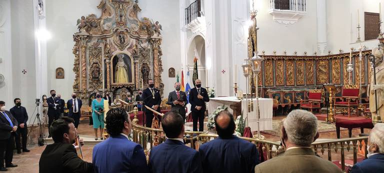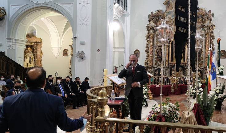 La Catedral de Huelva acogía anoche el pregón de la romería 2021 de la Real Hermandad de Emigrantes de Nuestra Señora del Rocío de Huelva, a cargo del almonteño José Manuel Pérez Martínez, que fue presentado por su hijo José Manuel Pérez Villa y que contó con la asistencia del alcalde de Huelva, Gabriel Cruz, la concejala de Hábitat Urbano e Infraestructura, Esther Cumbreras, una amplia representación de la Hermandad de Huelva y de la Sagrada Lanzada.
