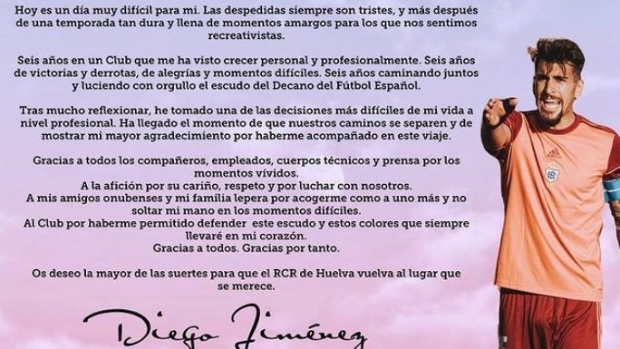 "Es un día muy difícil para mi". Así ha calificado la jornada de hoy Diego Jiménez, capitán del Recreativo de Huelva en las últimas temporadas, que esta mañana abandonaba definitivamente el Nuevo Colombino tras llegar a un acuerdo con el club onubense para rescindir el contrato que unía a ambas partes hasta 2023.