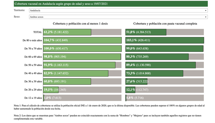 Entre tanto, en Andalucía un 60% de la población de entre 30 y 39 años tiene al menos una dosis de la vacuna, mientras que entre los 20 y los 29 años el indice alcanza los 19,5. En el gráfico se puede comprobar las cifras por franjas de edad.