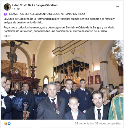 La Hermandad Cristo de la Sangre hacía lo propio en nombre de la Junta de Gobierno y la entidad, trasladando el pésame a la familia e infinitos amigos de Garrido. Además, pedía una oración por el eterno descanso de su alma que recibirá cristiana sepultura este martes a las 18:30 en la iglesia de San Juan.