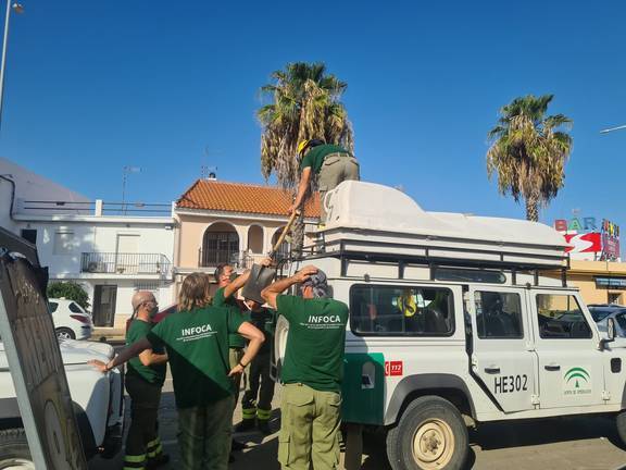 Un total de 34 efectivos del Plan @Plan_INFOCA están trabajando en el despliegue de limpieza y retirada de escombros que ha causado las intensas precicipitaciones registradas esta mañana en Lepe, Ayamonte, Isla Cristina y Cartaya. A lo largo de la tarde se sumarán 20 más.