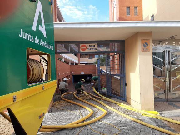 El jueves estuvieron en el Edificio Navicoas Playa, en La Antilla, donde recalaron tras el temporal 7.000 metros cúbicos de agua en el interior de su garaje.