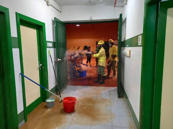 Una de las intervenciones que más ha sido aplaudida es la acaecida en el Colegio Alonso Barba de Lepe. Bomberos Forestales y Agentes de Medio Ambiente acompañados de varios camiones autobombas y varios voluntarios del municipio, han estado trabajando codo con codo hasta ahora para dejar las instalaciones en las mejores condiciones posibles y así poder recibir a un alumnado que necesita volver a sus aulas.