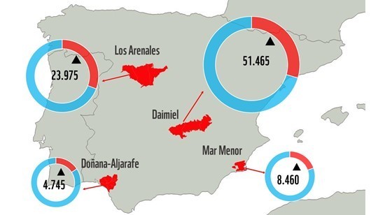 Por otro lado en Doñana y Aljarafe, el humedal más importante de Europa, los datos que ha obtenido WWF concluyen que la superficie regada con agua extraída ilegalmente, en el corazón de este espacio clave para la biodiversidad y alrededores, es de más de 4.700 hectáreas, el equivalente a más de 5.700 campos de fútbol.