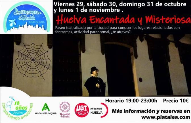 - Viernes 29, sábado 30, domingo 31 y lunes 1 a las 19:00 – Huelva encantada y misteriosa – Paseo teatralizado para conocer los lugares de terror, por Platalea