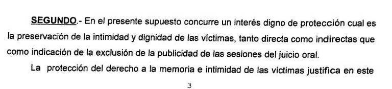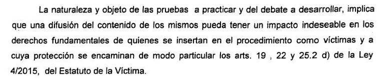 Además, el auto indica que la naturaleza y objeto de las pruebas a practicar y el debate a desarrollar implican que "una difusión de los mismos puede tener un impacto indeseable en los derechos fundamentales de quienes se insertan en el procedimiento como víctimas".