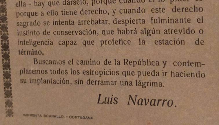 Uno de los pilares en los que se basaron los republicanos durante su mandato, el de la cultura popular para todos y todas las vecinas, inspira un último párrafo que afirma “podéis también alegar que el pueblo está falto de capacidad para gobernarse; a nadie más que a vosotros mismos haréis responsables del defecto aludido, si existiendo cometéis la avilantez de denunciarlo; aunque creo -sin temor a equivocarme- que en ese orden de cultura está el obrero más capacitado que vosotros”. “Lo que el pueblo quiere –con instrucción o sin ella- hay que dárselo, porque cuando él lo pide, es porque a ello tiene derecho”, sentencia Luis Navarro al final de su panfleto.