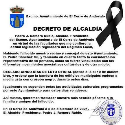 Tras el pésame de los compañeros y compañeras del concejal, el alcalde de El Cerro de Andévalo, Pedro José Romero, ha decretado cinco días de luto oficial en el municipio. Un decreto de Alcaldía dictado por el mandatario cerreño explica y justifica la decisión de declarar cinco días de luto oficial por el fallecimiento del concejal "teniendo en cuenta tanto la consideración representativa de su persona como su fuerte vinculación con los diferentes movimientos asociativos culturales y de otra índole".