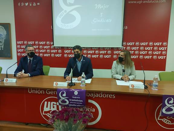 UGT Huelva ha organizado una jornada con motivo del 8 de marzo, "Día Internacional de la Mujer", que este año se ha celebrado en la sede del sindicato UGT Huelva bajo el título “Mujer y Sindicato” en el que han participado en el acto de inauguración el secretario general de UGT Huelva, Sebastián Donaire, el Delegado de Igualdad, Políticas Sociales y Conciliación de la J. Andalucia, Manuel Antonio Conde del Rio y la Diputada de presidencia de la Diputacion Provincial de Huelva, Belén Castillo.