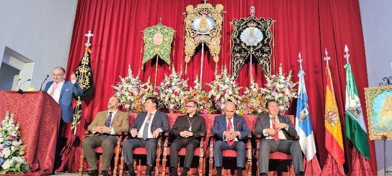 El acto estuvo presidido por el vicario episcopal para la Administración de los Bienes Diocesanos y Relaciones Institucionales, canónigo de la catedral, párroco de Nuestra Señora de la Merced de Huelva y director espiritual de Emigrantes, Jaime Jesús Cano; el alcalde de Huelva, Gabriel Cruz; el presidente de Emigrantes, José Francisco Garrido y por el hermano mayor José Antonio Ortiz. Contando también con miembros de la corporación municipal.