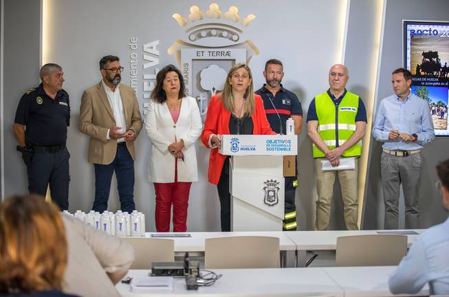 La primera teniente alcalde de Economía, Presidencia y Relaciones Institucionales, María Villadeamigo; el concejal de Movilidad y Seguridad Ciudadana, Luis Albillo; y la concejala de  Hábitat Urbano e Infraestructuras, Esther Cumbrera, han presentado en rueda de prensa el dispositivo especial que pone en marcha el Ayuntamiento de la capital de cara a la salida de las hermandades de Emigrantes y de Huelva hacía la aldea de El Rocío. Un acto que ha contado también con la asistencia del jefe de la Policía Local, Rafael Mora; el jefe de Protección Civil, Miguel Ángel Gómez; el sargento de Bomberos, Francisco Javier Álvarez Bayo, y el gerente de Aguas de Huelva, Pedro Peña.