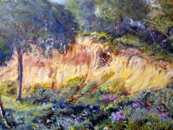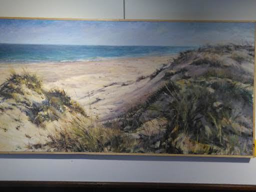 Me siento junto a ella en una mesa alta rodeados de los doce cuadros expuesto y que cuatro de los cuales han sido adquiridos a las primeras horas de inaugurar su exposición, y nos miramos como hurgando en nuestro ayer. En aquellos que fuimos y estos que ahora somos. Le digo que me hable de su colección y sus ojos castaños melosos se mueven ligeros tras las gafas de nácar blanquecina como su cabello corto, linda y atractiva. Es una exposición a la que no le he puesto nombre, es más bien una selección de los temas y paisajes que más me gustan e identifican, me dice. Es el resultados de muchas y muchas horas de trabajo.