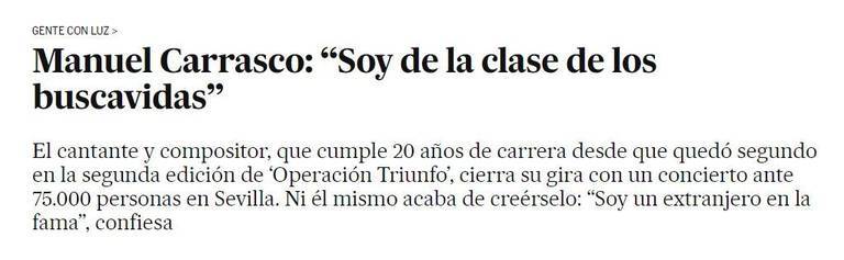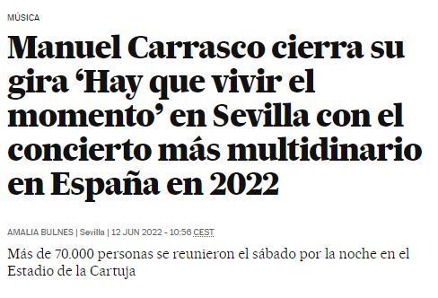 Y después, el rotativo catalán añade: "Carrasco acumula ya ocho discos de estudio y en los últimos años giras multitudinarias y algún hito histórico, como ser el primer solista español en anunciar un concierto en el Wanda Metropolitano, estadio en el que también agotó las entradas.