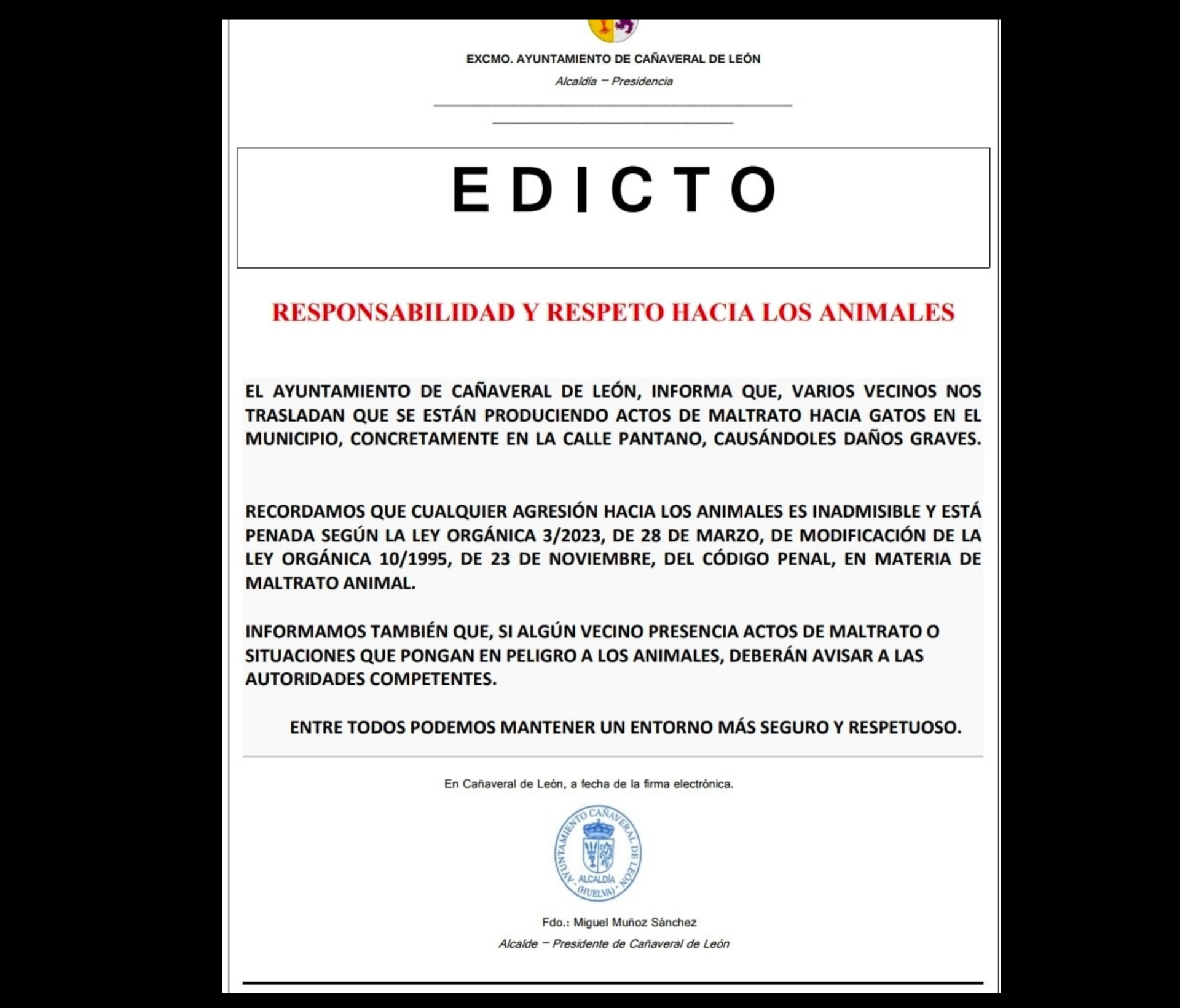 Ante esta situación, el Consistorio ha difundido un edicto en el que recuerda que “cualquier agresión hacia los animales es inadmisible y está penada por ley”. En este sentido, advierte que la Ley Orgánica 3/2023, de 28 de marzo, que modifica el Código Penal en materia de maltrato animal, endurece las penas para quienes causen lesiones o provoquen la muerte de animales domésticos o amansados.
